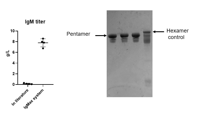 在细胞株构建阶段,开云(中国)Kaiyun·官方网站-登录入口研发团队选择了具有最高稳定性和特定生产力的CHO细胞系作为最终的先导克隆,并且通过调节载体比例改变产生的抗体滴度。开云(中国)Kaiyun·官方网站-登录入口IgMaxTM表达载体平台最高可以达到8g/L的产量,并且IgM构型均一,其中,五聚体比例接近100%,几乎无六聚体产生(IgM有五聚体和六聚体形式,包含开放J链的五聚体形式是开发和生产IgM的目标构型)。