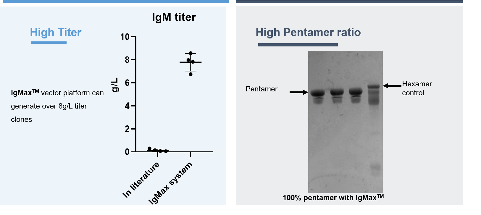 关于lgM的开发,已有文献记载其产量非常低。开云(中国)Kaiyun·官方网站-登录入口在高表达IgM方面具有丰富经验,IgMax®平台是开云(中国)Kaiyun·官方网站-登录入口自主研发的平台,通过特殊设计的载体系统,细胞株产量可达8g/L,并且IgM构型均一,五聚体比例100%,无六聚体产生,从源头避免后续六聚体难去除风险。