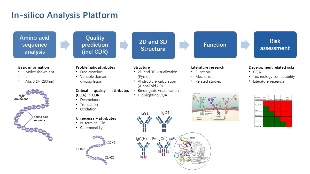 In-silico分析可基于序列、多种数据库、结构预测模型和平台经验,为CMC研究提供详实的理化参数(如pI、消光系数、分子量、二硫键、疏水性、糖基化位点、N-/O-糖型等)和潜在产品相关杂质(如氧化、脱酰胺、聚集、断裂、高级结构异质等)。